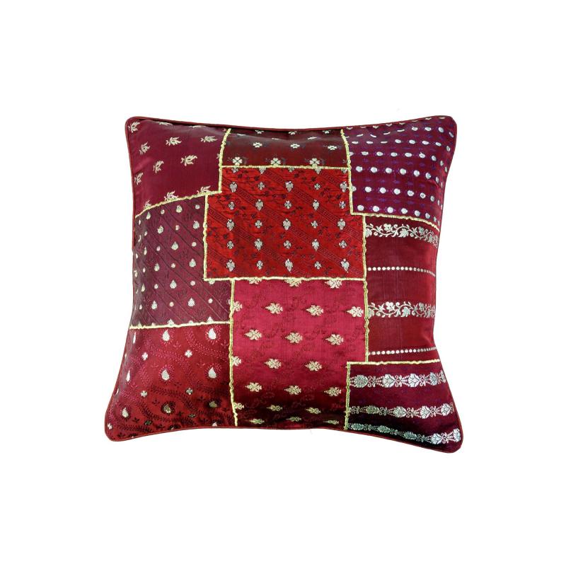 Fremstillet af indisk sariPatchwork designMed ensfarvet stof på bagsidenMåler 40×40 cmSælges uden pudefyld (Læs mere)