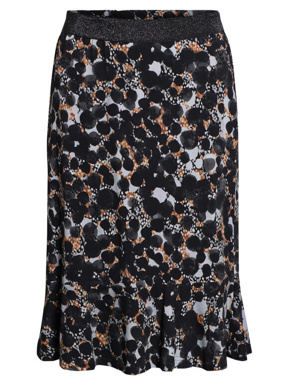 Signature nederdel med glimmer elastikkant i taljen og fin flæsekant forneden. Nederdel er mønstret med sorte bomber og grå og gyldne pletter på grå bundfarve. Længde lige ned over knæene. Nederdelen er i jersey stof og ikke foret. 95 % viscose og 5 % ela (Læs mere)